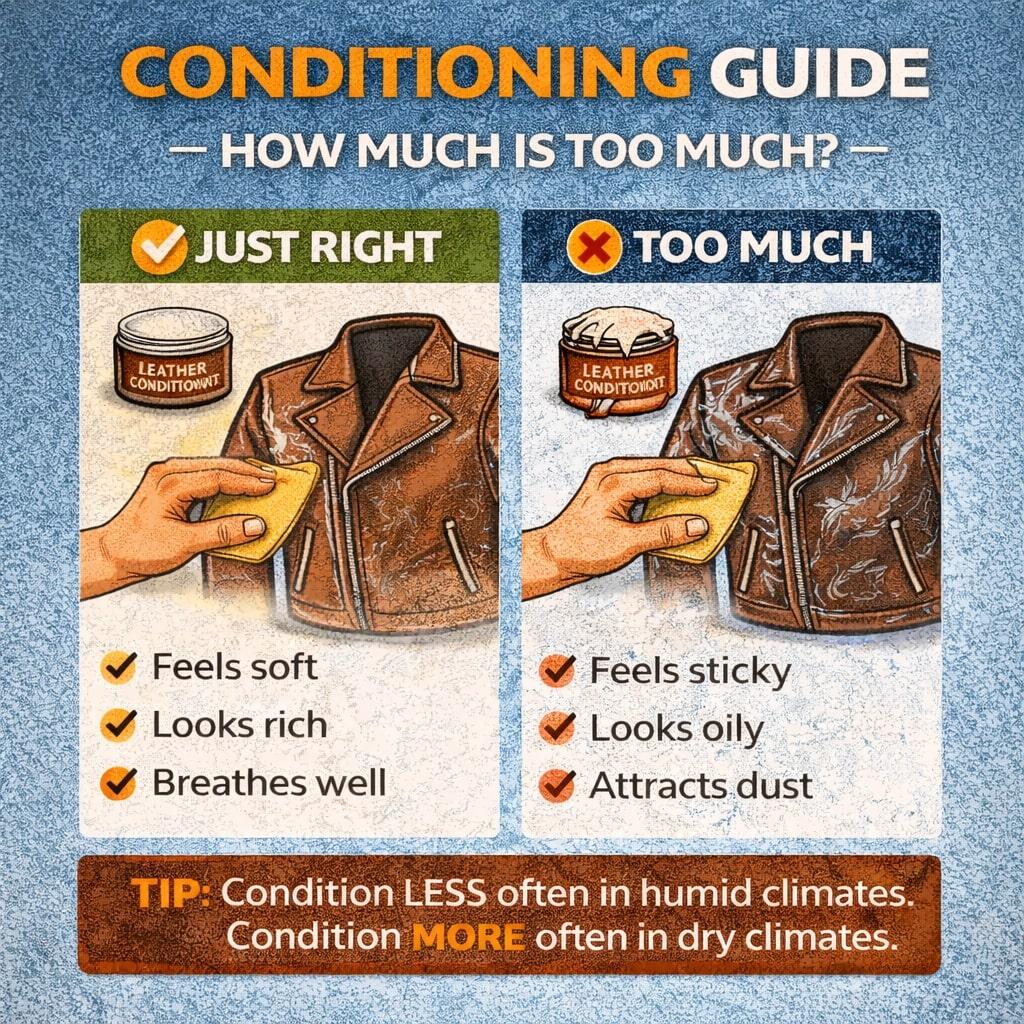 Die Pflege (Conditioning) hält das Leder flexibel. Sie ersetzt Öle, die durch Hitze, Schweiß und Zeit verloren gegangen sind. Aber zu viel Pflegemittel macht das Leder klebrig und schwer.