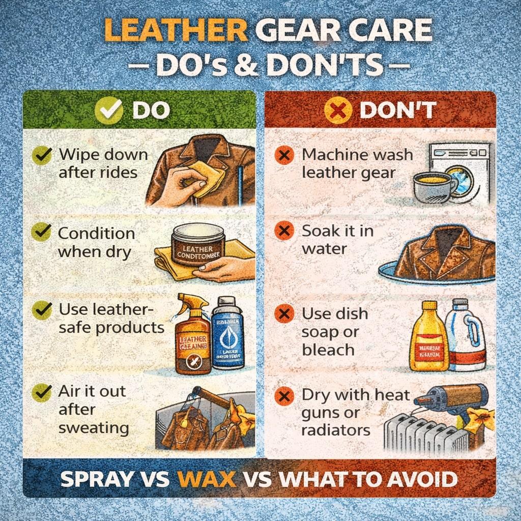 Wählen Sie ein atmungsaktives, wasserabweisendes Spray oder Wachs, das speziell für Motorrad-Lederbekleidung entwickelt wurde. Vermeiden Sie stark silikonhaltige Sprays, welche die Poren verstopfen.