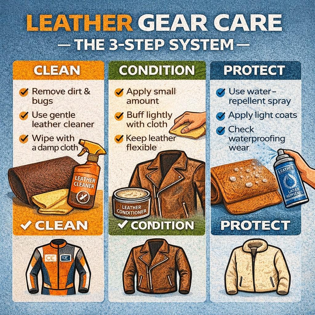 Leder ist zwar robust, braucht aber Aufmerksamkeit. Schweiß, Sonne, Regen, Straßenschmutz und Hitze setzen dem Material langsam zu. Wenn Sie Ihre Ausrüstung richtig reinigen und pflegen, hält sie länger und fühlt sich bei jeder Fahrt besser an.